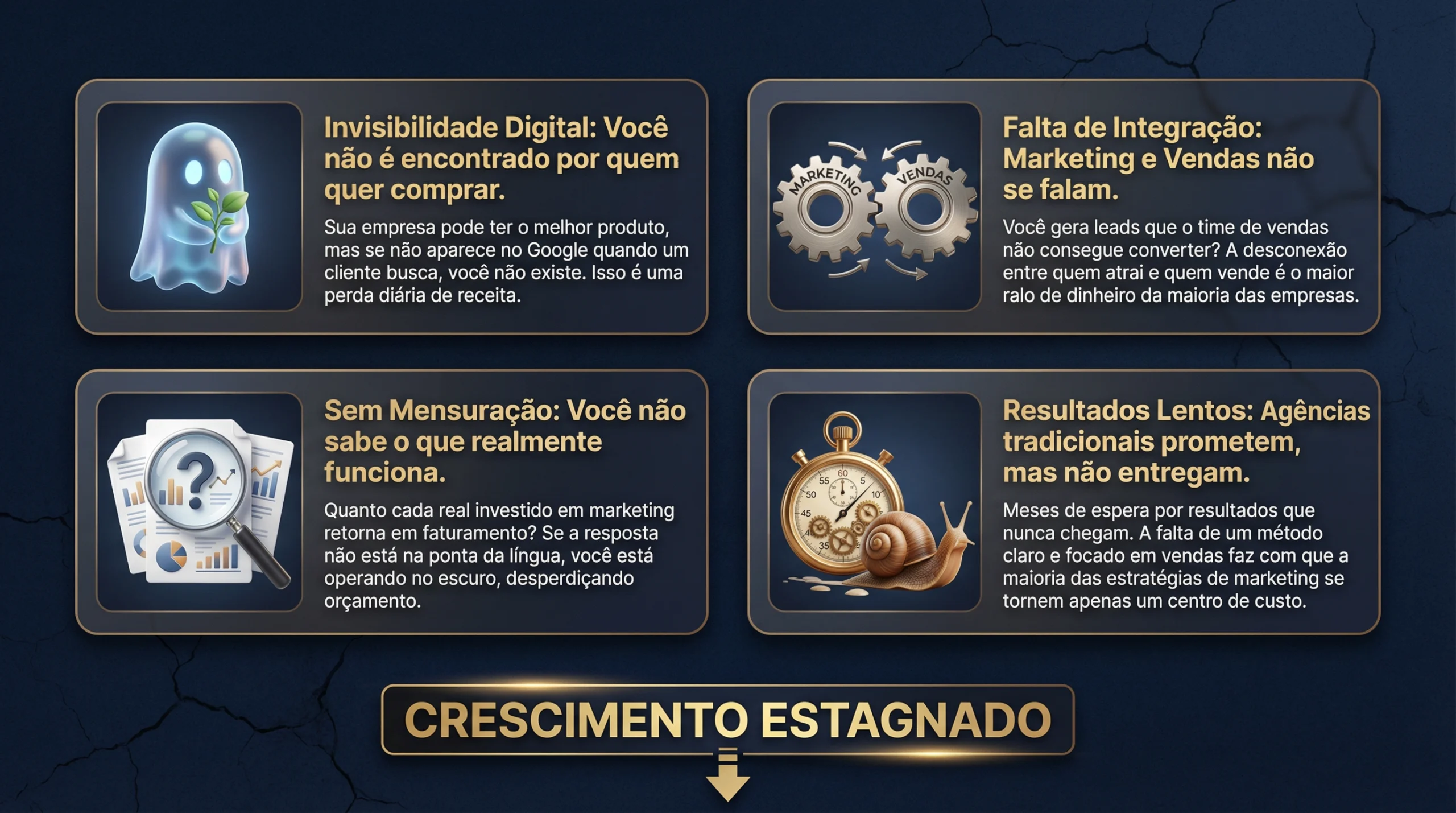 O problema não é o marketing. É a falta de diagnóstico, método e execução orientada a métricas. Nós fornecemos exatamente isso.